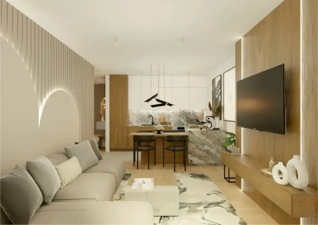 Projekt apartamentu na wynajem sezonowy to połączenie funkcjonalności z nowoczesnym, przytulnym charakterem.