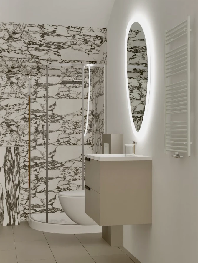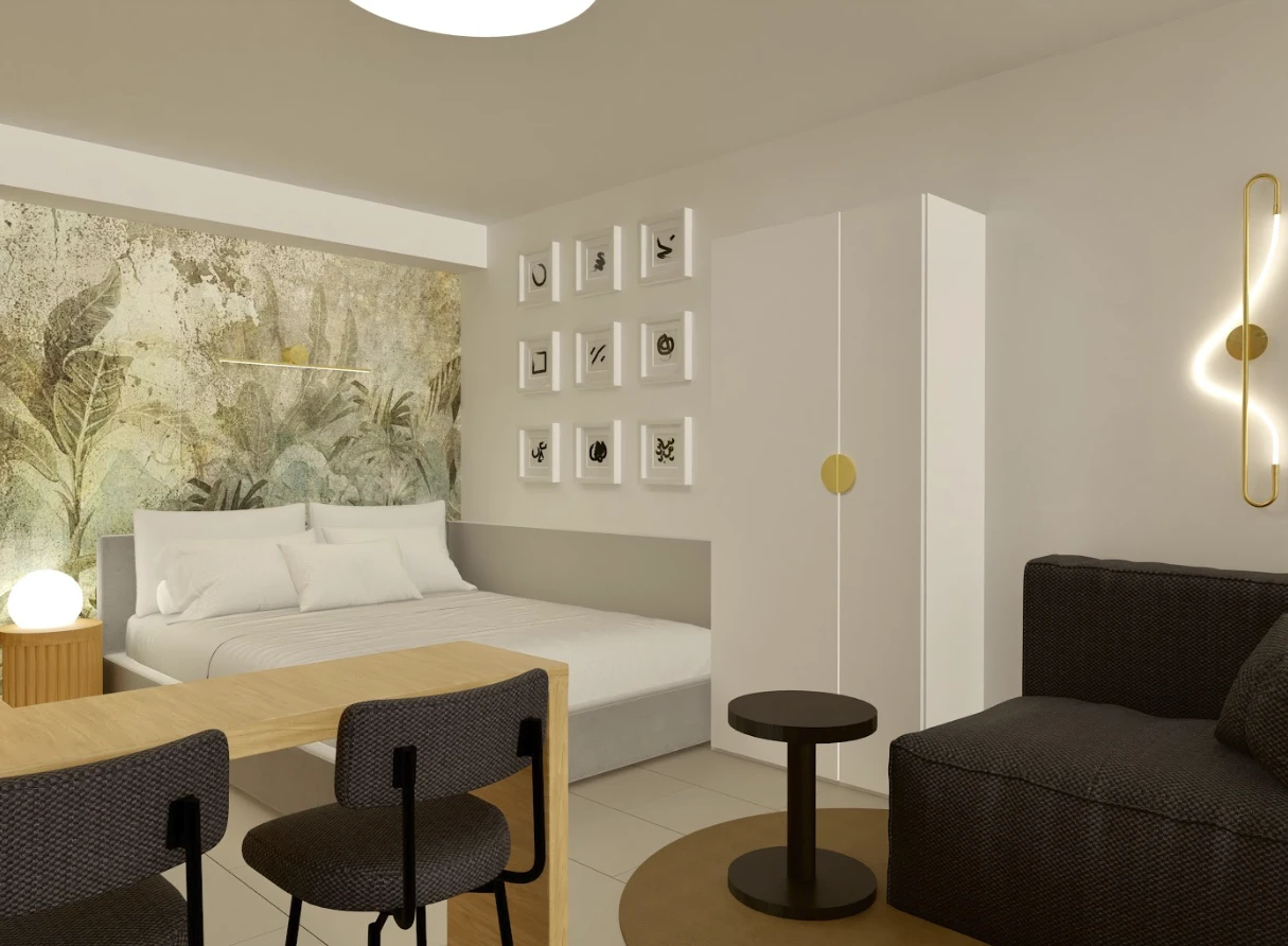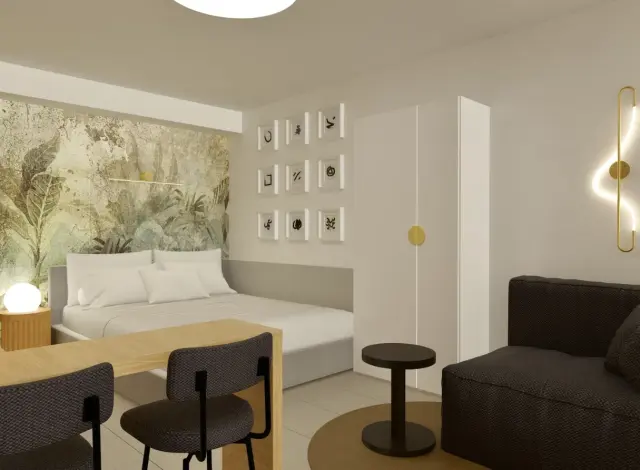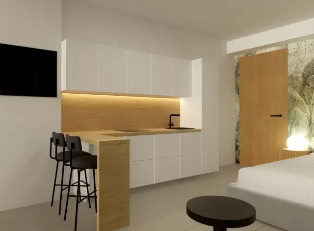 Kameralna kawalerka stworzona z myślą o krótkoterminowym wypoczynku, która mimo niewielkiego metrażu daje poczucie oddechu i kontaktu z naturą. Wnętrze zdominowane jest przez zielenie, beże i ciepłe brązy – barwy ziemi, które wyciszają i relaksują. Centralny punkt stanowi tapeta z motywem lasu, która optycznie pogłębia przestrzeń i wprowadza unikalny nastrój. Funkcjonalne rozwiązania oraz przemyślane detale sprawiają, że to miejsce jest gotowe na wszystko – poranną kawę, wieczorny odpoczynek czy krótki city break.