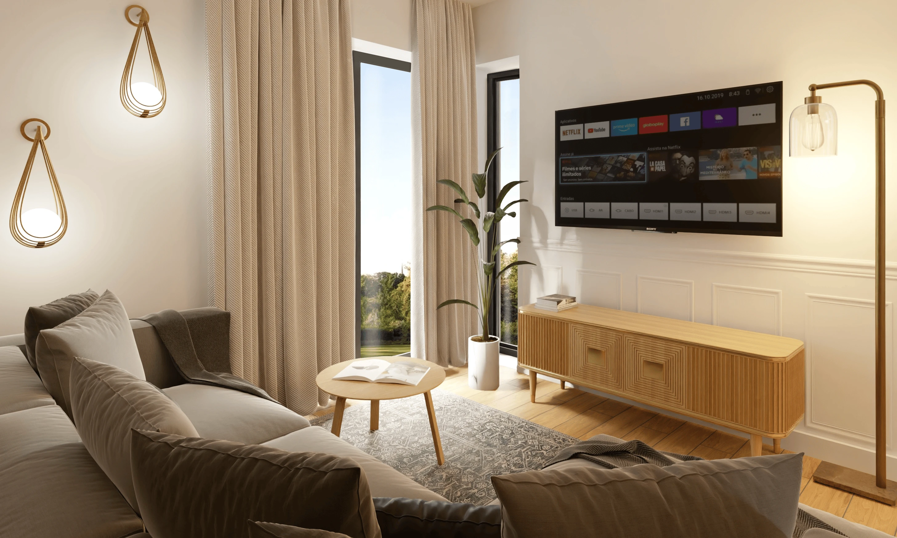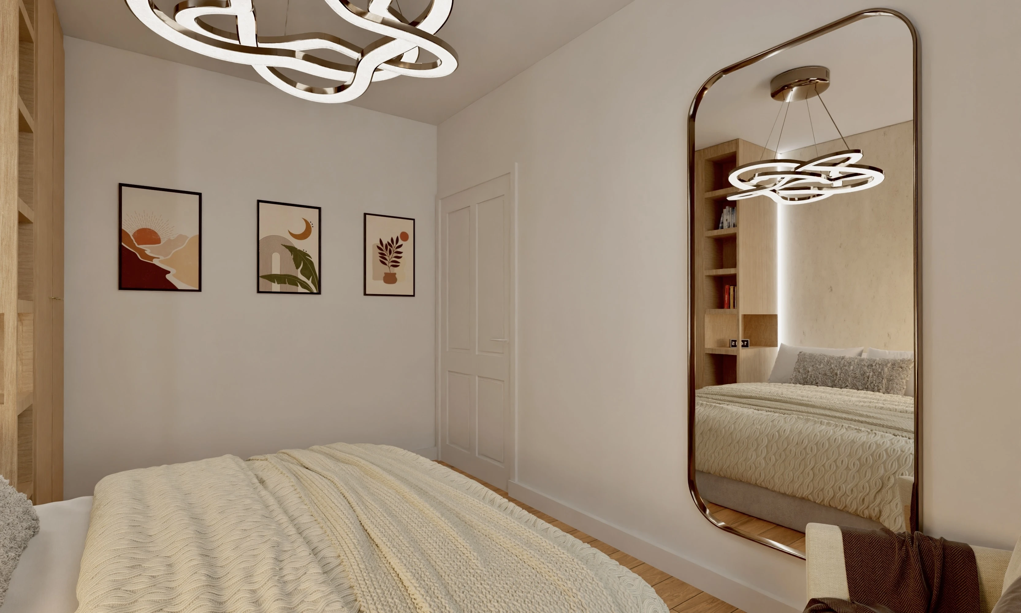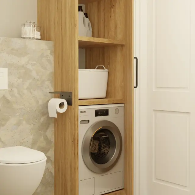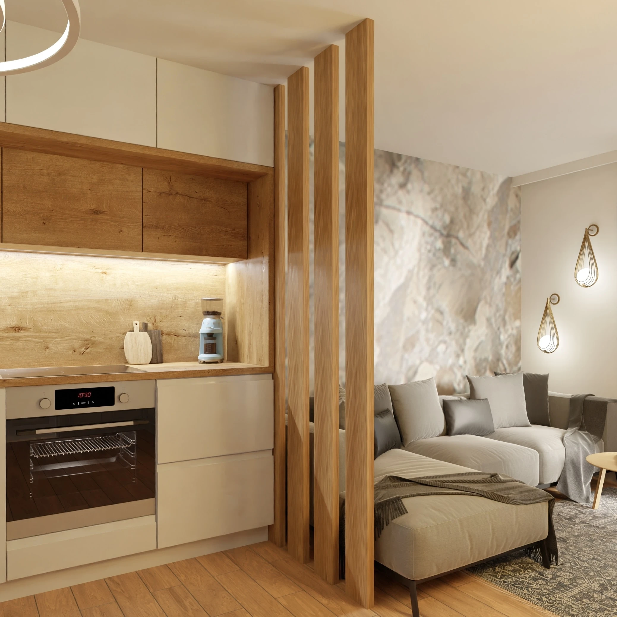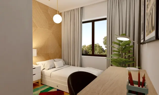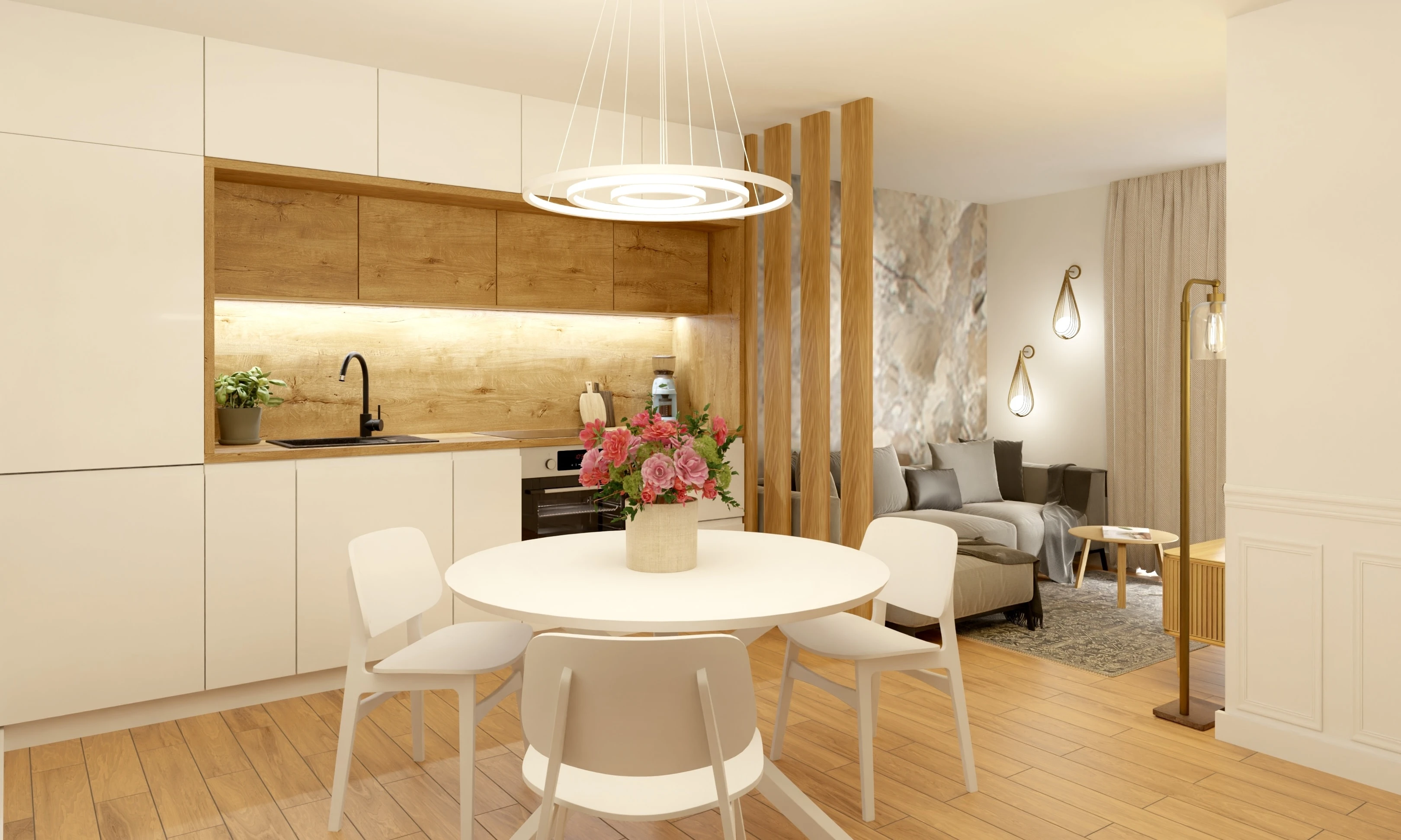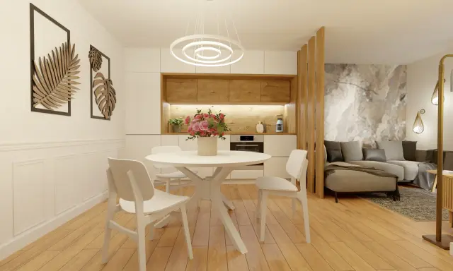 Wnętrze tego apartamentu to pochwała naturalnego światła i przyjaznej kolorystyki. Jasne beże, biel i drewno budują atmosferę spokoju i domowego ciepła. Przemyślany układ sprzyja codziennemu komfortowi – kuchnia z jadalnią, funkcjonalna strefa dzienna oraz przytulne sypialnie. Całość dopełniają miękkie tkaniny, minimalistyczne formy i detal w subtelnej odsłonie.
