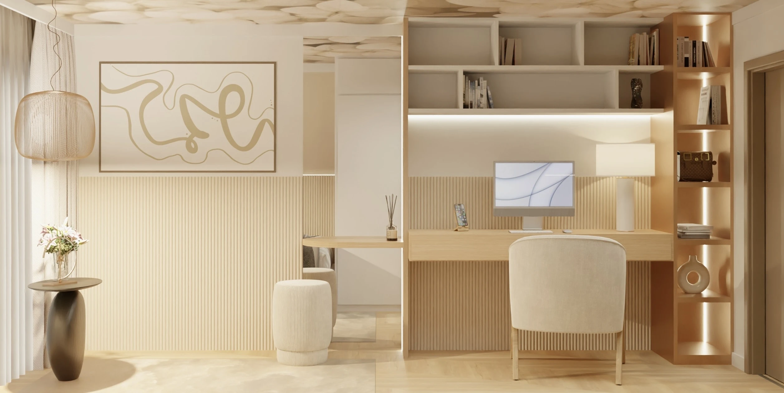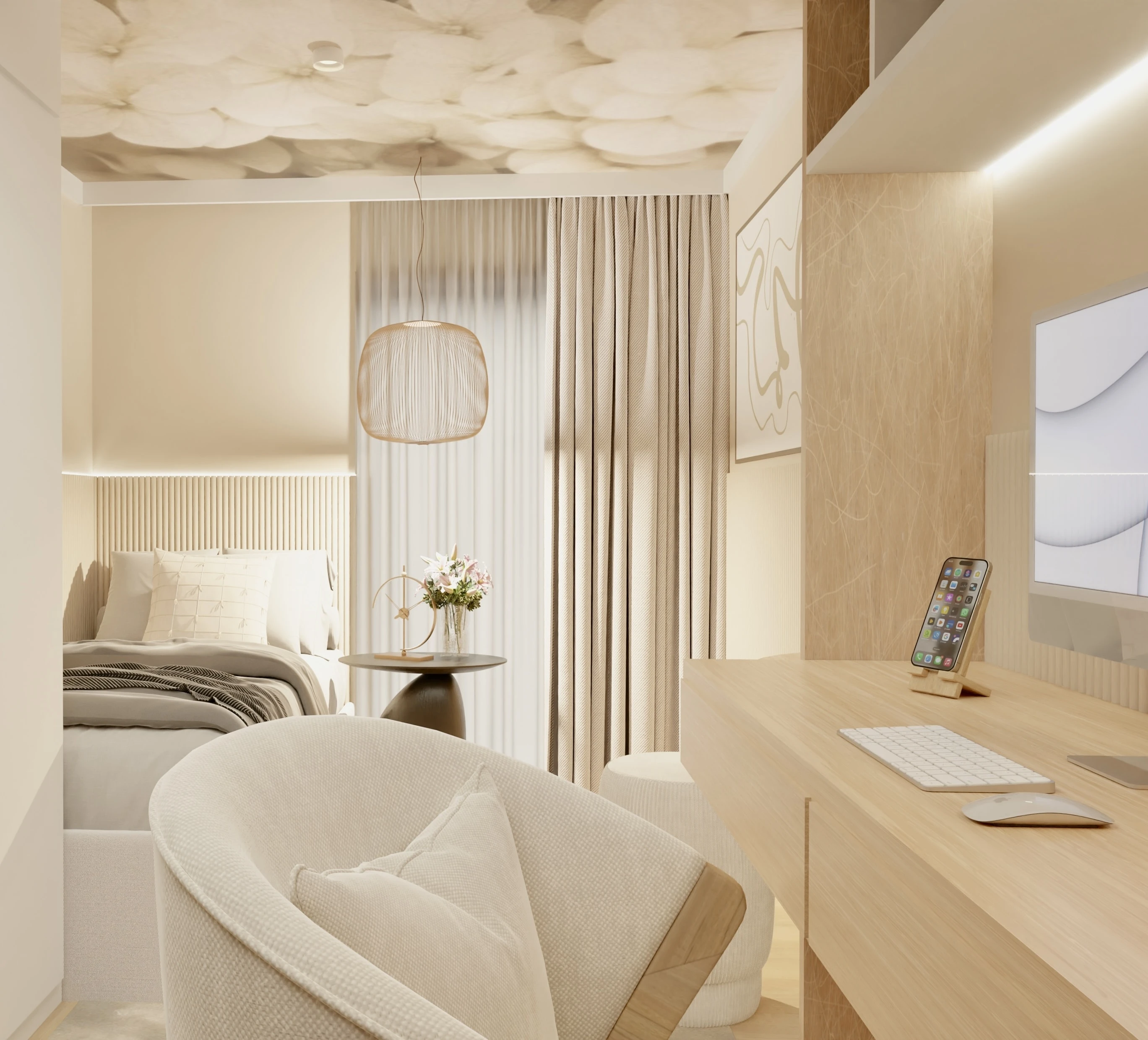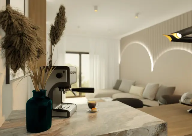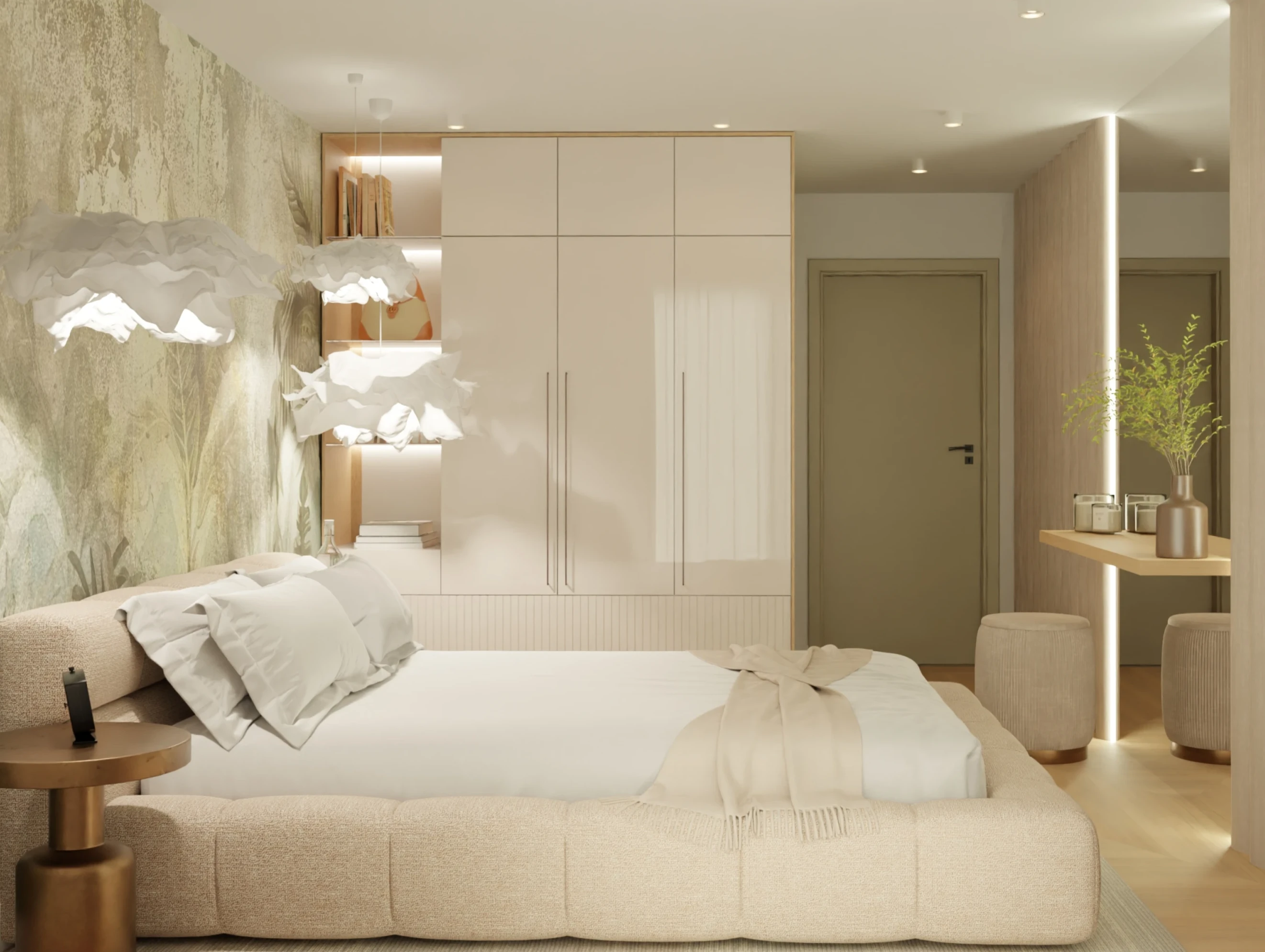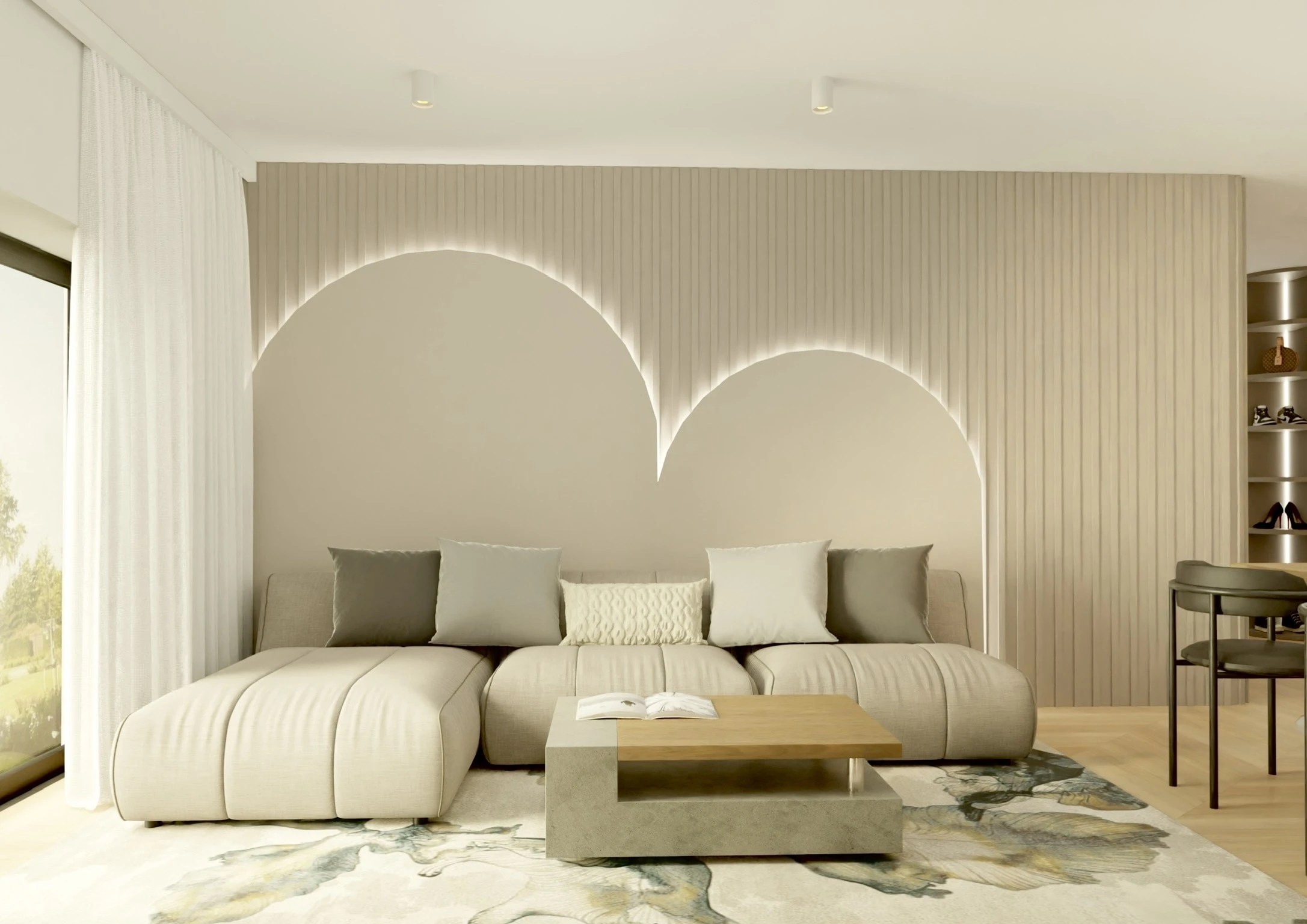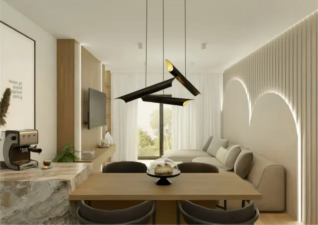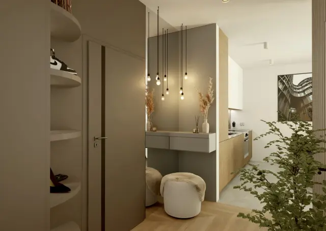 To mieszkanie to opowieść o świetle, harmonii i miękkiej estetyce. Wnętrze zbudowane wokół jasnych barw, naturalnych materiałów i subtelnych form. Pojawiają się tu łagodne łuki, delikatne faktury i roślinne motywy, które wprowadzają spokój i poczucie bliskości z naturą.
