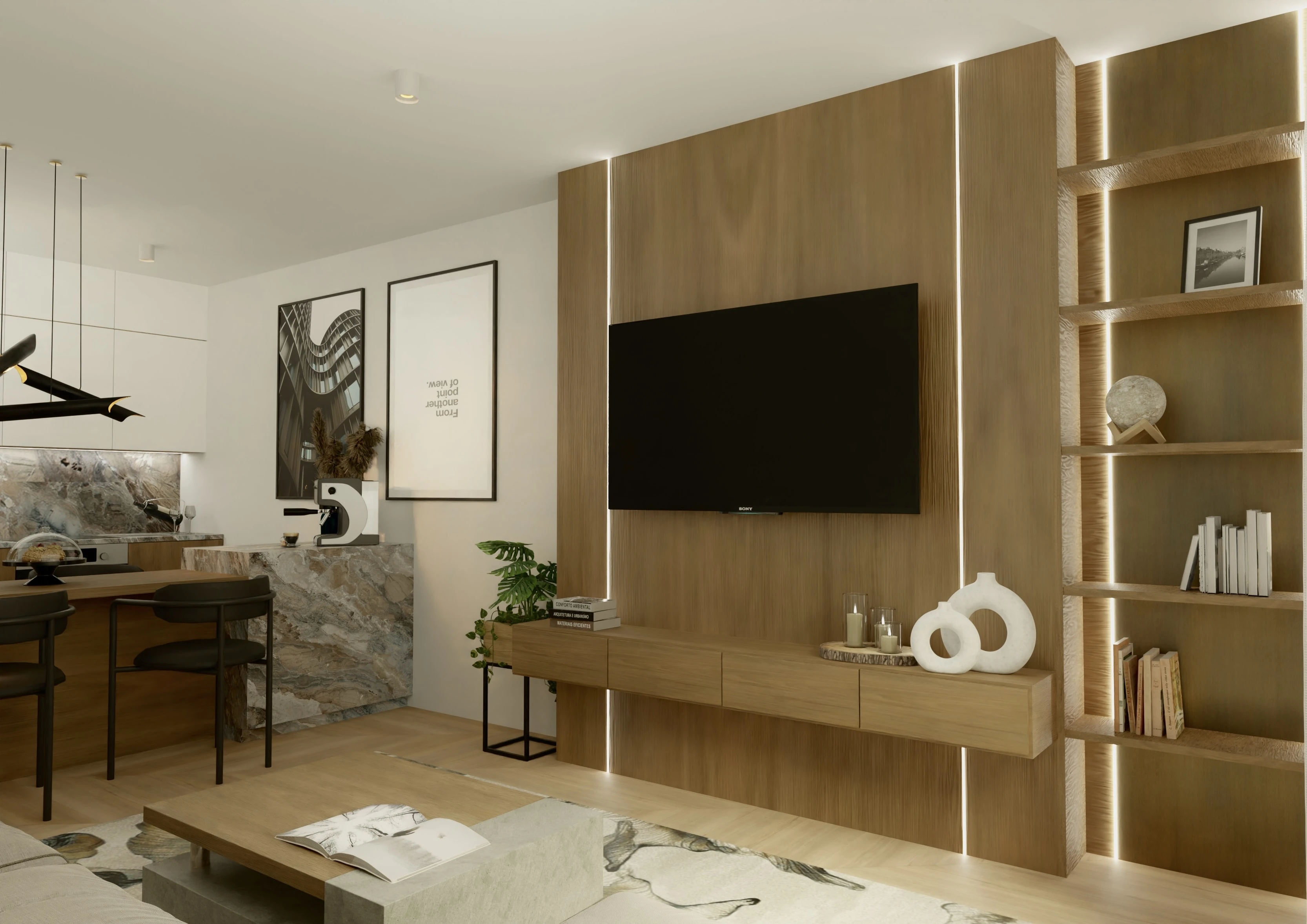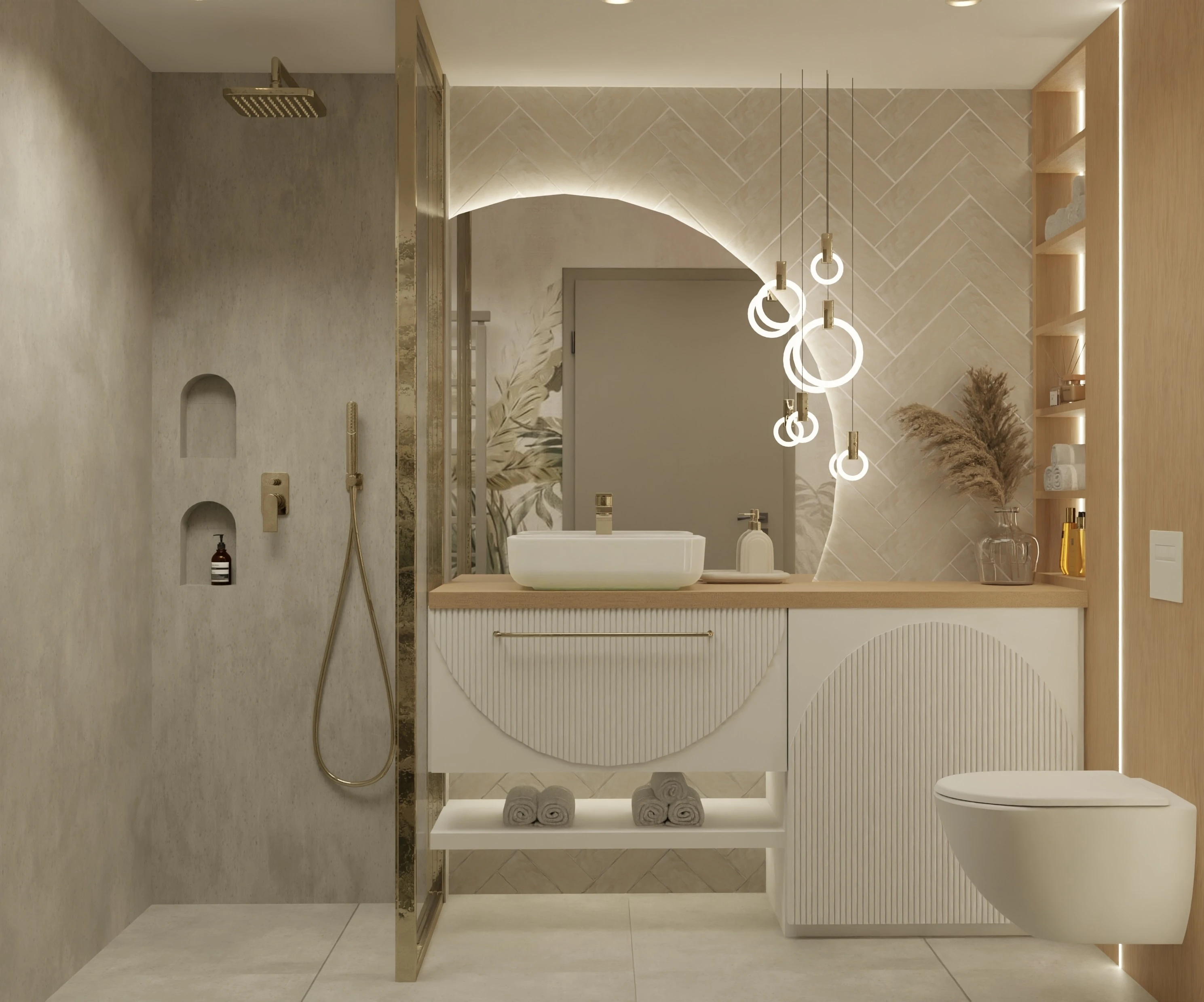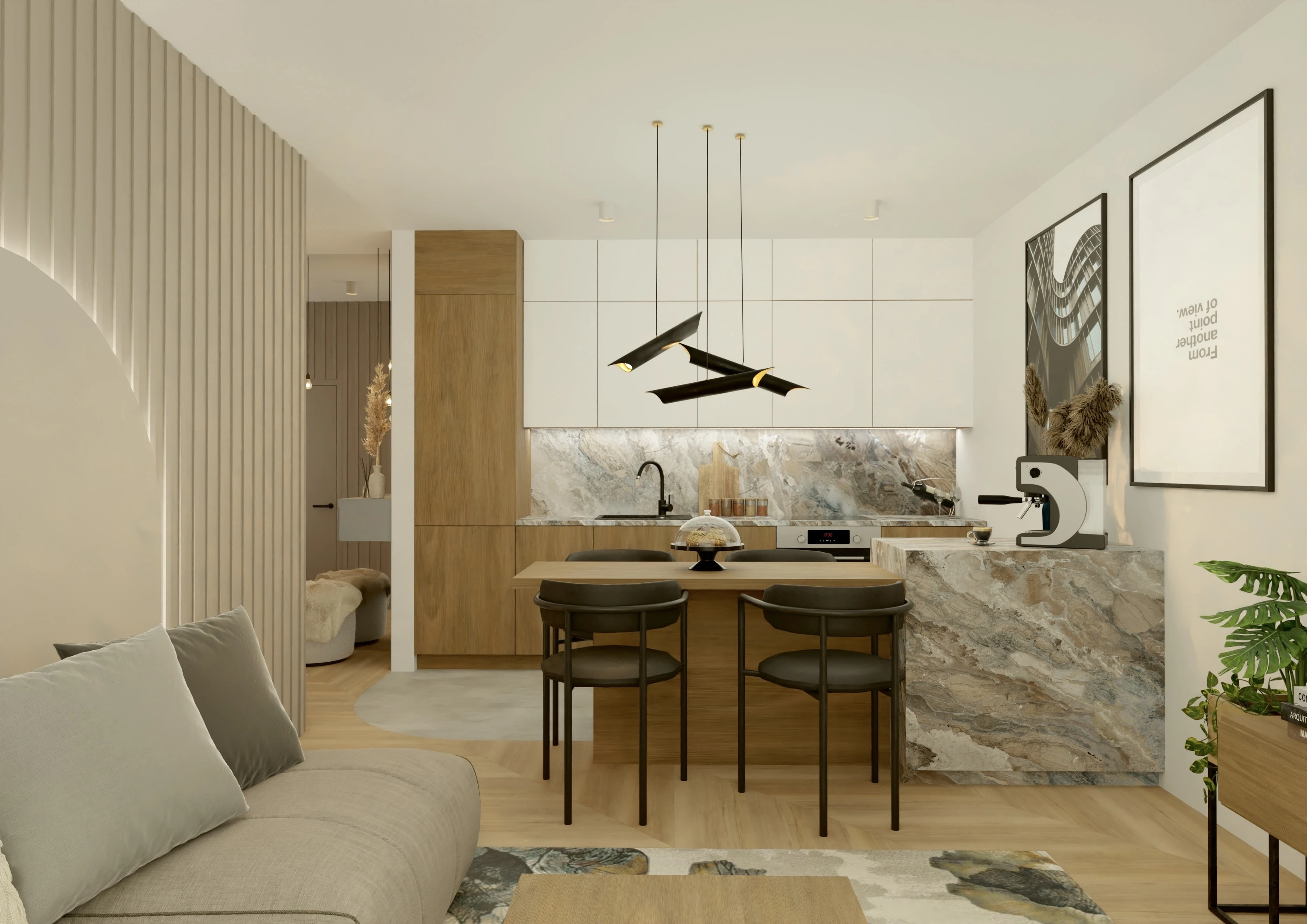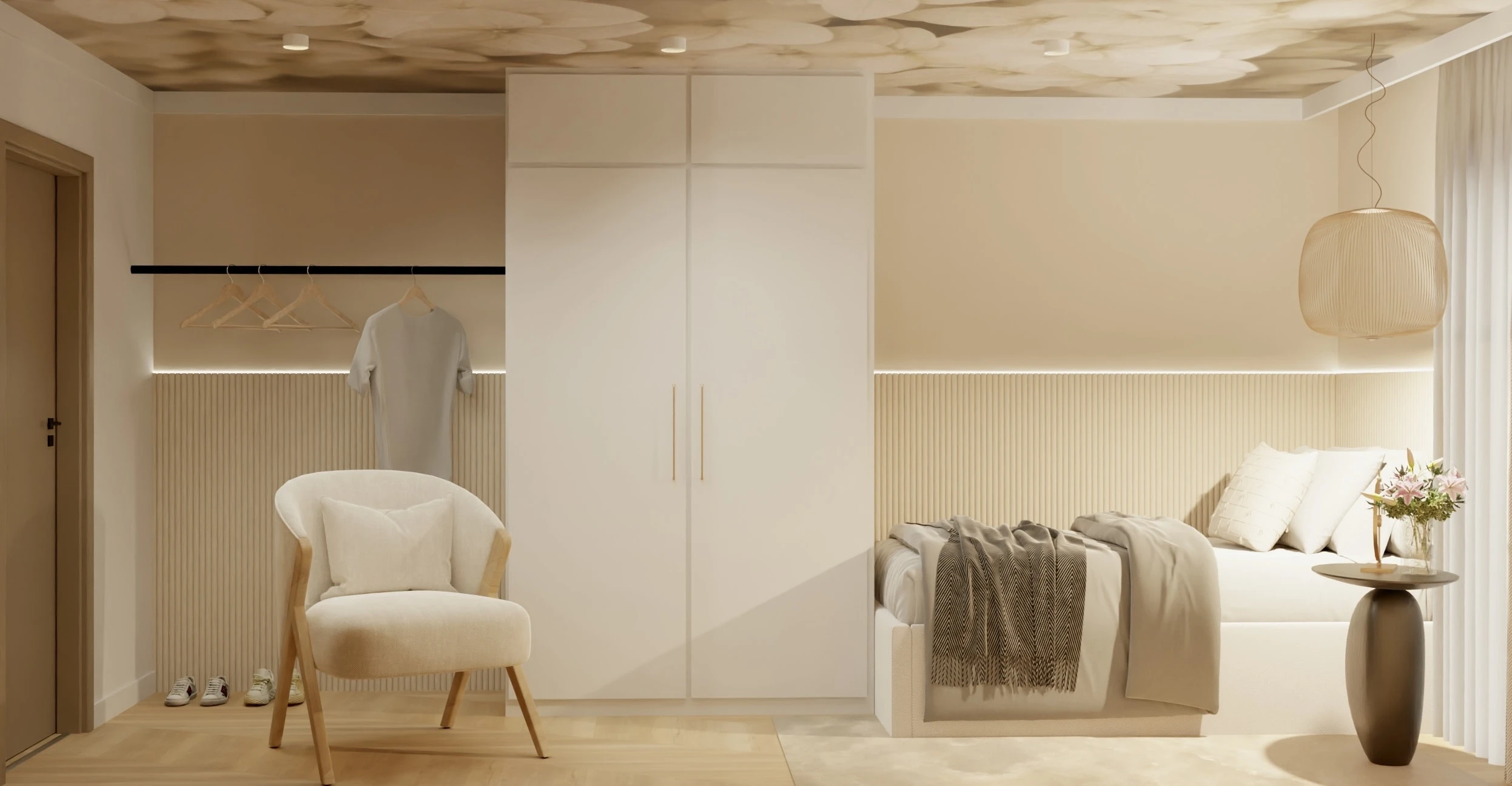 To mieszkanie to opowieść o świetle, harmonii i miękkiej estetyce. Wnętrze zbudowane wokół jasnych barw, naturalnych materiałów i subtelnych form. Pojawiają się tu łagodne łuki, delikatne faktury i roślinne motywy, które wprowadzają spokój i poczucie bliskości z naturą.