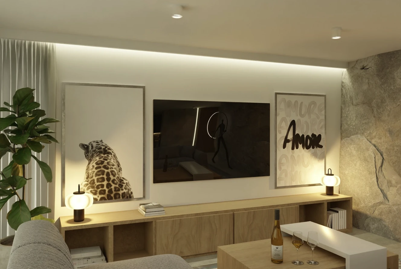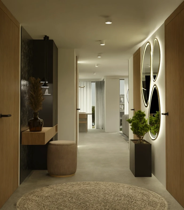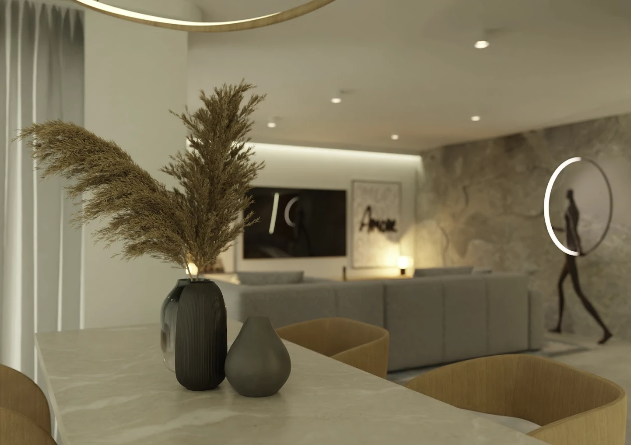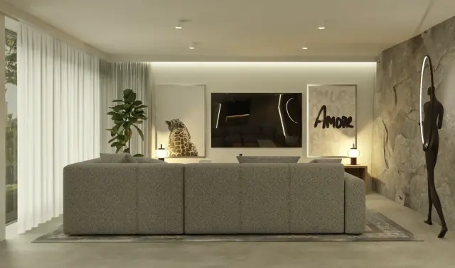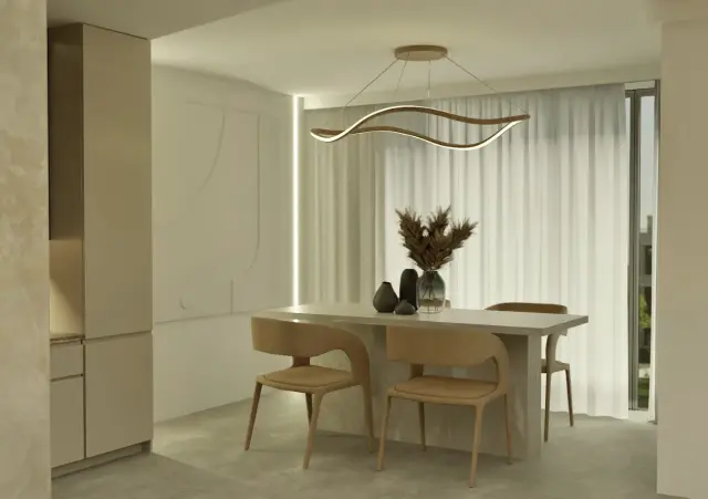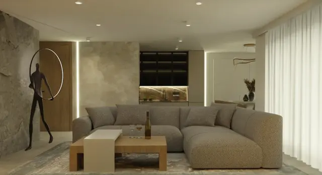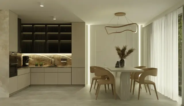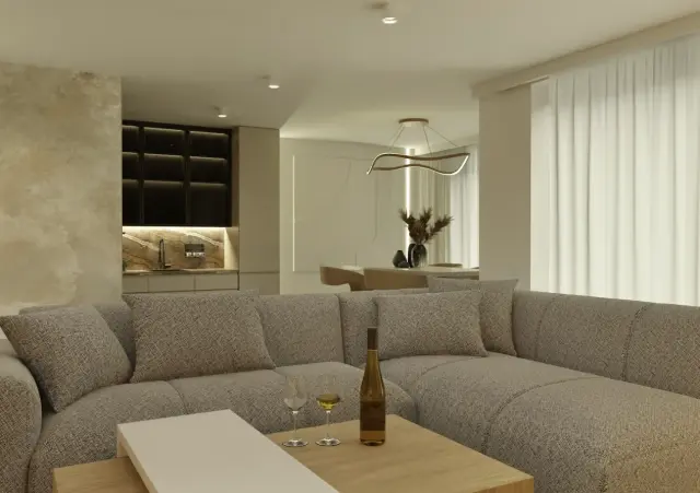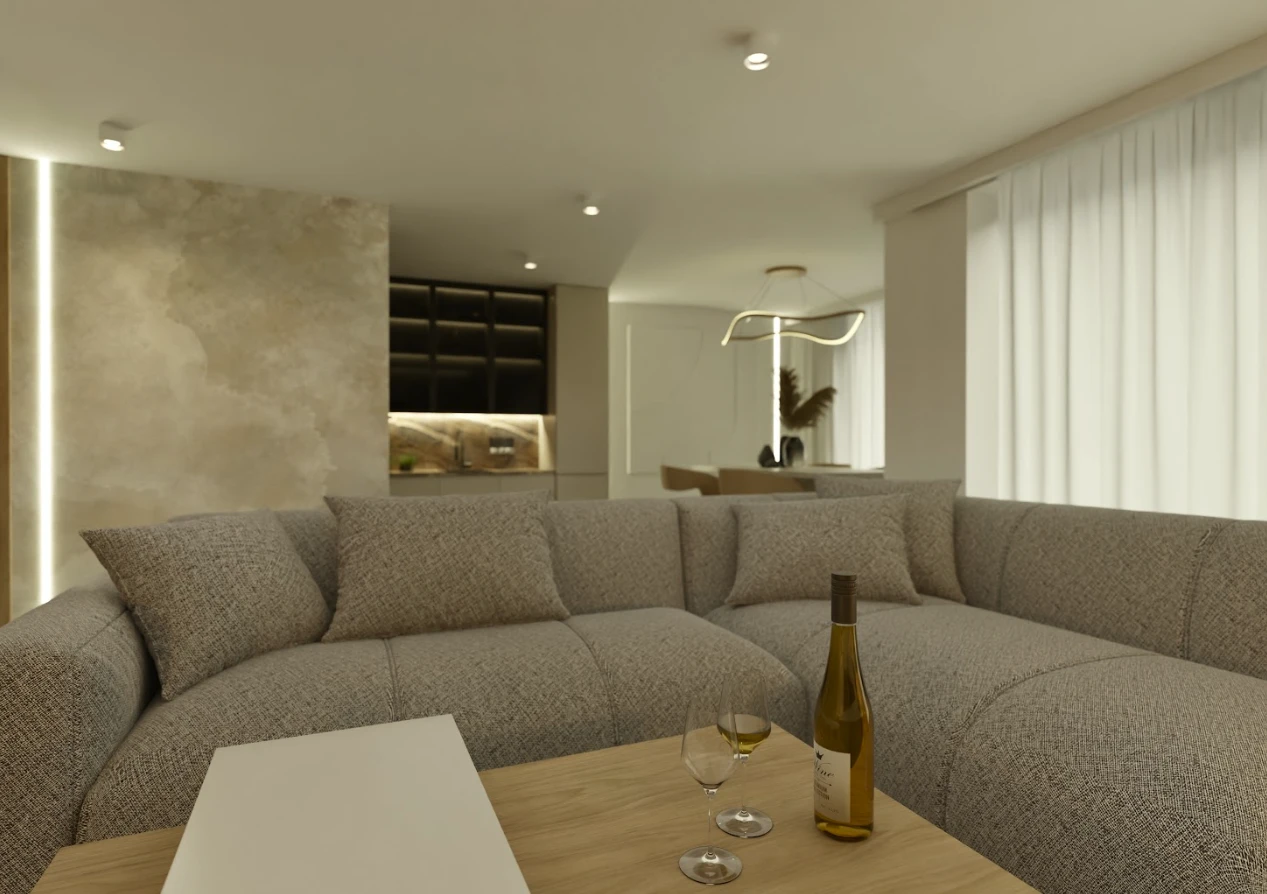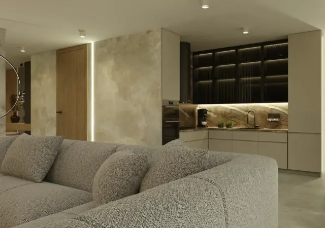 To wnętrze zaprojektowane z myślą o wygodnym, codziennym funkcjonowaniu – ale z klasą. Całość utrzymana jest w ciepłych beżach i kremach, z delikatnymi kontrastami w postaci ciemniejszych dodatków. Otwarta strefa dzienna tworzy przestrzeń sprzyjającą spotkaniom i relaksowi, a miękkie tkaniny i subtelne światło budują spokojny, elegancki klimat. Projekt łączy estetykę z funkcjonalnością – bez nadmiaru, ale z charakterem.